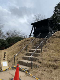 箱根関所を順路通りに見学していると、途中に、50段ほどの階段を上がった先に遠見番所へ見学に行くことができます。この丘の頂上への階段を登るのがやや疲れますが、頑張って登り、遠見番所からの眺めをぜひ見に行っていただけると良いと思います。